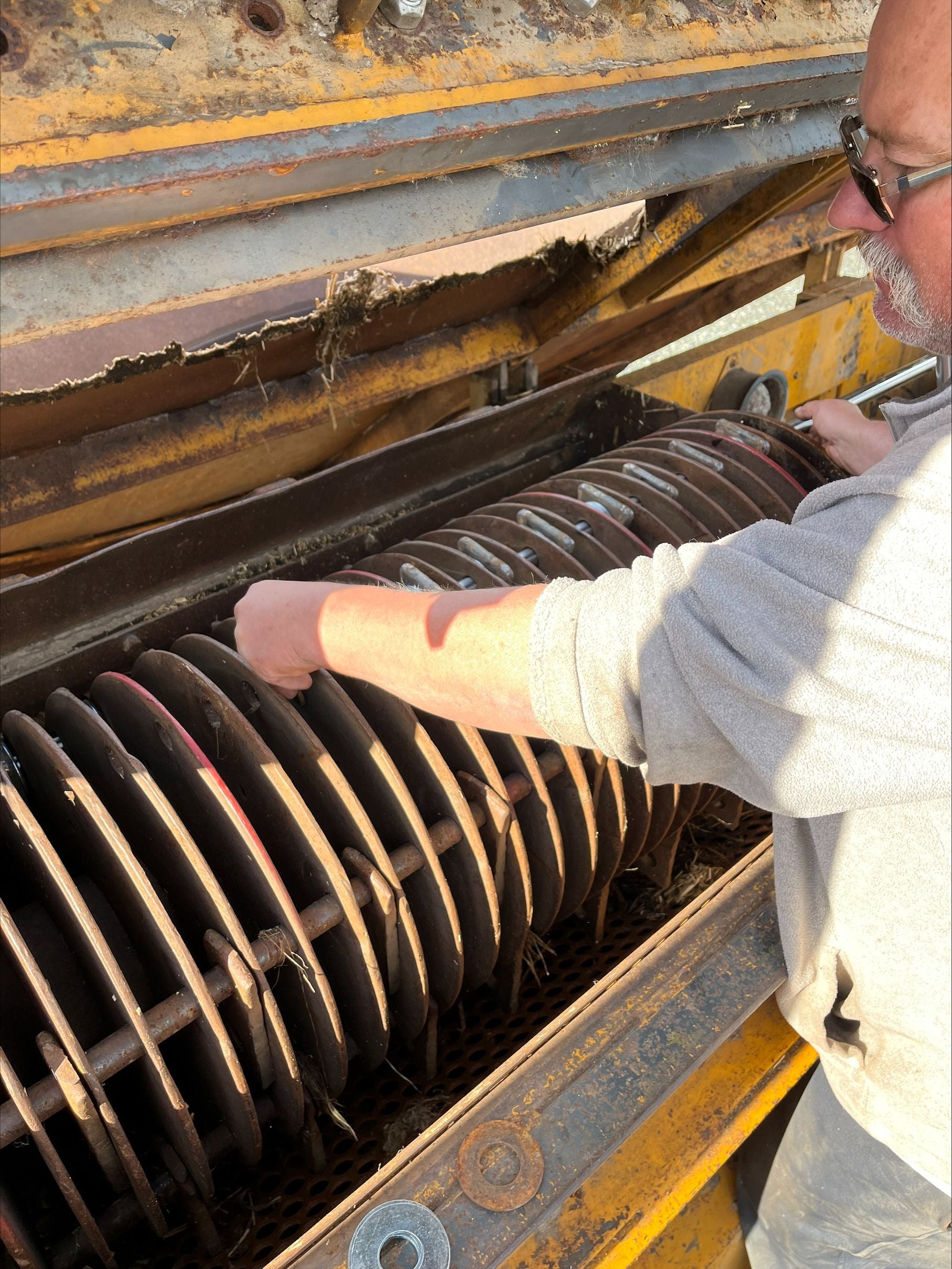 🔧 Recent Work: Replaced bottom steel floor panels in tub Added pressure/flow control valve to adjust conveyor speed Replaced hammer knives and 6 rods and added knives for a total of 84 new knives Three new screens ¾”, 1” and 2” round hole screens for 26x48 mill